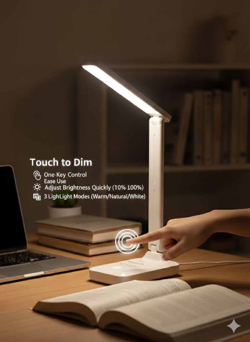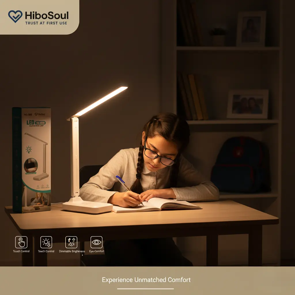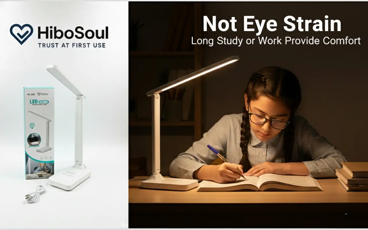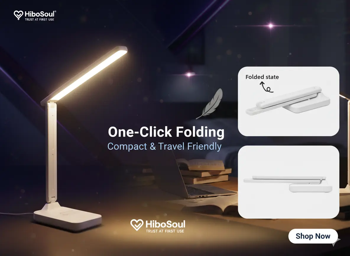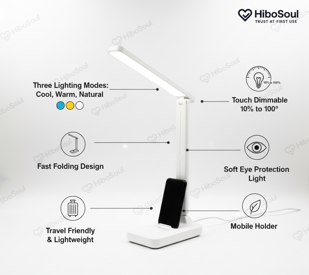 Meet the lamp that works as hard as you do. The HiboSoul TaskFlow Table Lamp is the ultimate companion for students, professionals, and late-night creators. Engineered to boost your focus and protect your eyes, this lamp delivers the perfect light for any task—from intense study sessions to relaxed reading. Its sleek, foldable design and smart features, like adjustable brightness and a built-in phone holder, make it an essential upgrade for any modern workspace. Stop settling for bad lighting and start working smarter.